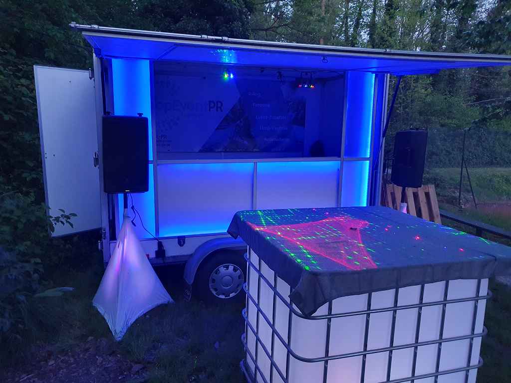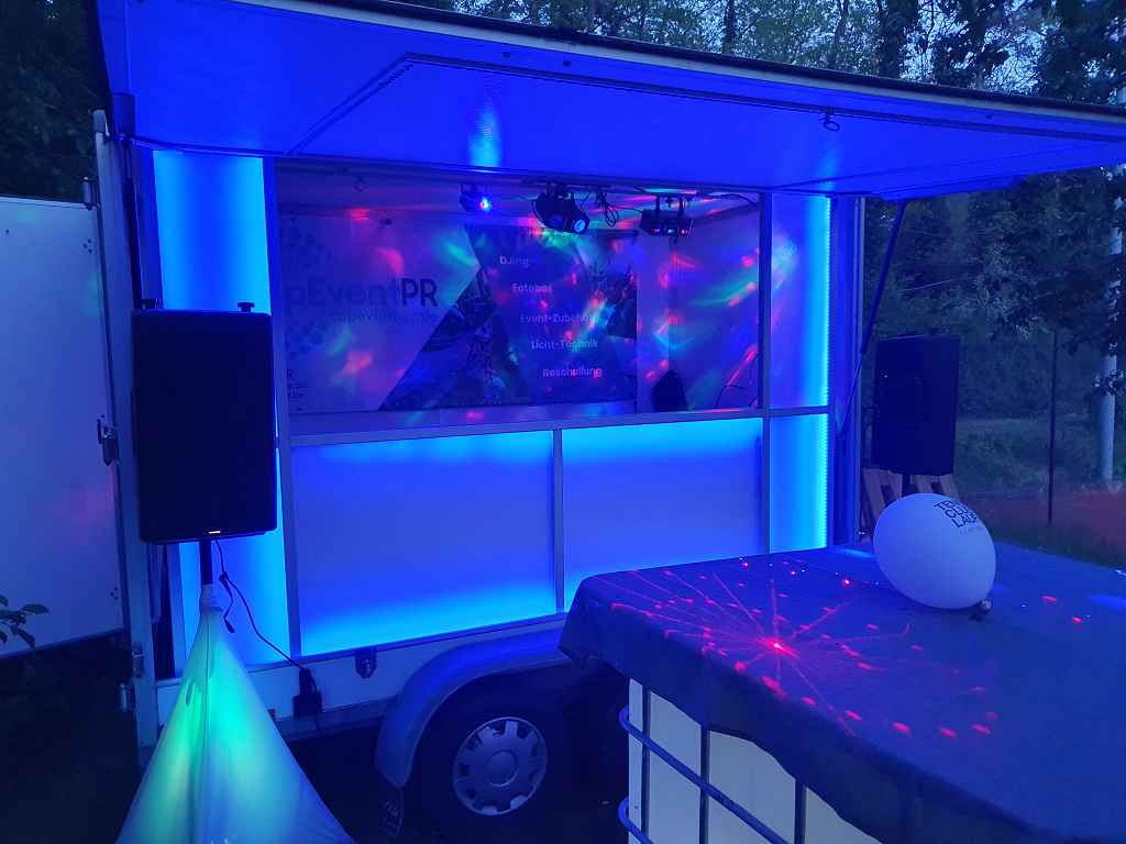 Ausgelegt um dem DJ eine perfekte Bühne zu bieten. In der Grundausstattung befinden sich 3 Tische sowie 2 Flower Partylichter. Zusätzlich kann eine Soundanlage oder weitere Lichter hinzugebucht werden.
